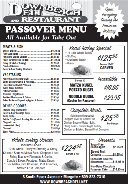 Downbeach Deli, located in Margate City, NJ, offers a variety of options in the deli, desserts, and sandwiches categories. The menu includes a selection of soups such as Borsht and Chicken Noodle Soup, as well as a range of salads like the Chef Salad and Greek Salad. Platters like the White Chunk Tuna Salad and Chopped Chicken Liver are also available. Customers praise the quality of the food, with many mentioning favorites like the Rueben sandwich and Jewish apple cake from the bakery. While some reviews note the smaller sandwich sizes, overall, Downbeach Deli is commended for its friendly service, classic deli offerings, and efficient delivery service. If you're craving traditional Jewish deli dishes, Downbeach Deli is a must-visit spot with ample parking in Margate City.